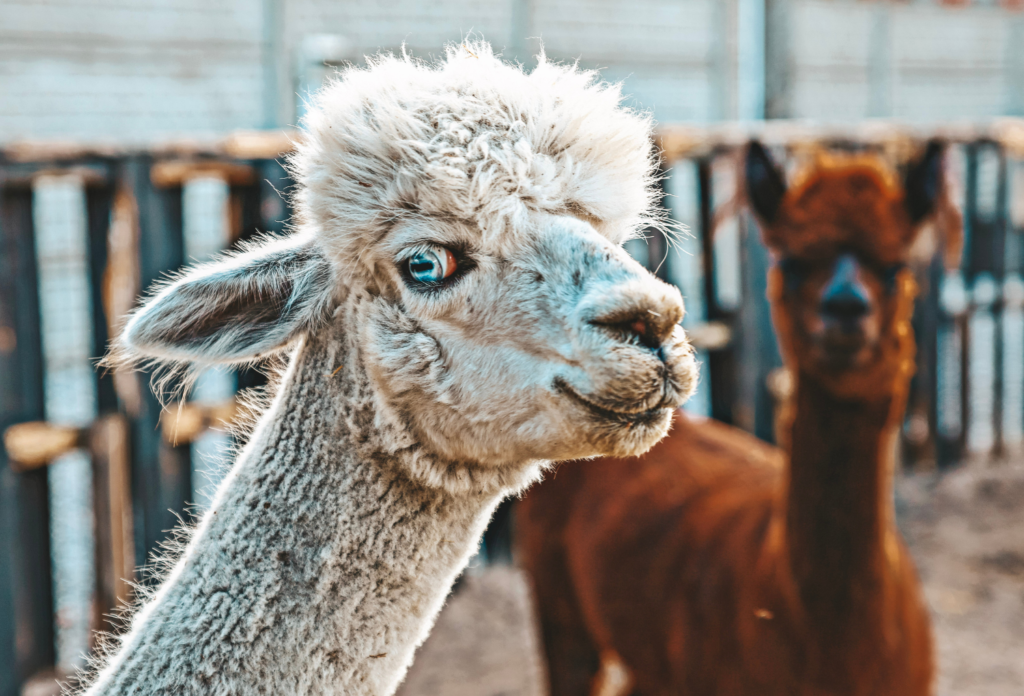 Alpaki to urocze, puszyste zwierzątka, które pochodzą z górskich rejonów Ameryki Południowej, a dokładniej z Peru, Boliwii, Chile i Argentyny. Ich mięciutka wełn jest bardzo ceniona i wykorzystywana do produkcji odzieży na całym świecie. Alpaki mają zazwyczaj przyjazne usposobienie. W naszej zagrodzie mieszka para alpak: Pusio i Megi. Ten pierwszy to biały samiec, który choć nieco nieśmiały, jest bardzo ciekawski. Mego zaś to czekoladowa piękność, która jak przystało na prawdziwa damę miewa humorki. Alpaki to roślinożercy, a ich dieta składa się głównie z trawy, ziół i innych roślin. Choć są to zwierzęta górskie, świetnie rdzą sobie w różnych warunkach – również w naszym klimacie.